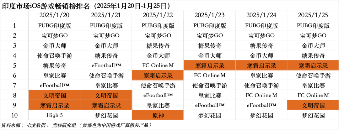 印度市场2025年1月20日-2025年1月25日iOS游戏类畅销榜中,点点互动《寒霜启示录》、TOP GAMES《文明帝国》、米哈游《原神》等产品进入畅销榜Top10。