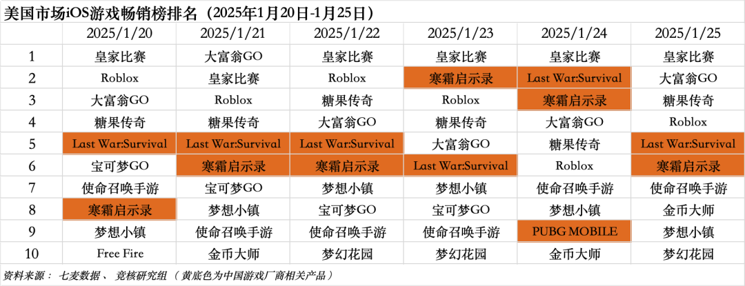 美国市场2025年1月20日-2025年1月25日iOS游戏类畅销榜中,元趣科技《Last War:Survival》、点点互动《寒霜启示录》、腾讯游戏《PUBG MOBILE》等产品进入畅销榜Top10。