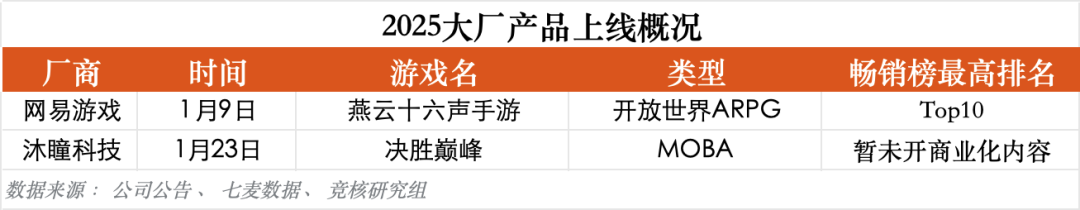 产品上新方面,截至1月26日,2025年上线的新品包括网易游戏水滴事业部开放世界ARPG游戏《燕云十六声》手游和沐瞳科技MOBA游戏《决胜巅峰》。