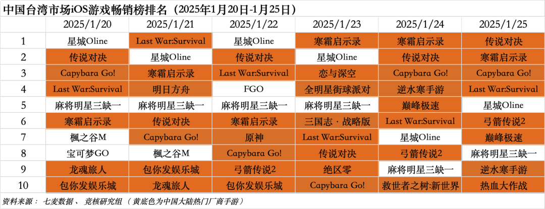 中国台湾市场2025年1月20日-2025年1月25日iOS游戏类畅销榜中,TOP10的大陆在台游戏包括腾讯游戏《传说对决》、元趣科技《Last War:Survival》、海彼网络《弓箭传说2》《卡皮巴拉go》、点点互动《寒霜启示录》、紫龙游戏《龙魂旅人》、米哈游《原神》、叠纸《恋与深空》等。
