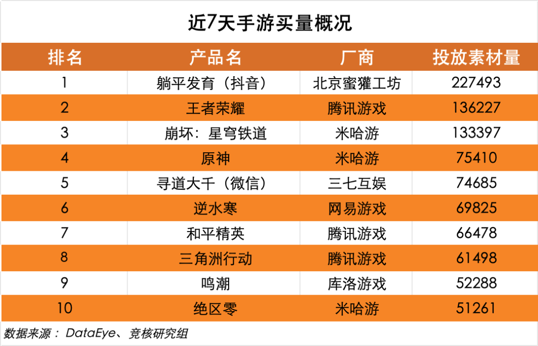 据DataEye数据显示,近7天的国内游戏买量榜单前十产品变动不大,腾讯《王者荣耀》《和平精英》《三角洲行动》、米哈游《崩坏:星穹铁道》《原神》《绝区零》、网易《逆水寒》、库洛《鸣潮》等大厂头部重度产品占据买量市场主导地位。