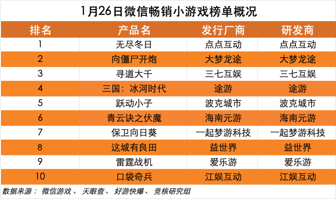1月26日微信畅销小游戏前十榜单中,大多还是老面孔,包括点点互动《无尽冬日》、大梦龙途《向僵尸开炮》、三七互娱《寻道大千》、途游《三国:冰河时代》等。