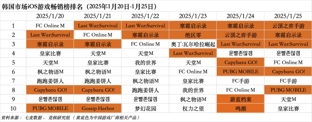 韩国市场2025年1月20日-2025年1月25日iOS游戏类畅销榜中,元趣科技《Last War:Survival》和点点互动《寒霜启示录》各登顶2天,腾讯游戏《云顶之弈手游》登顶1天。此外海彼网络《卡皮巴拉go》、悠星《蔚蓝档案》、库洛《鸣潮》、腾讯游戏《PUBG MOBILE》、柠檬微趣《Gossip Harbor》等产品进入畅销榜Top10。
