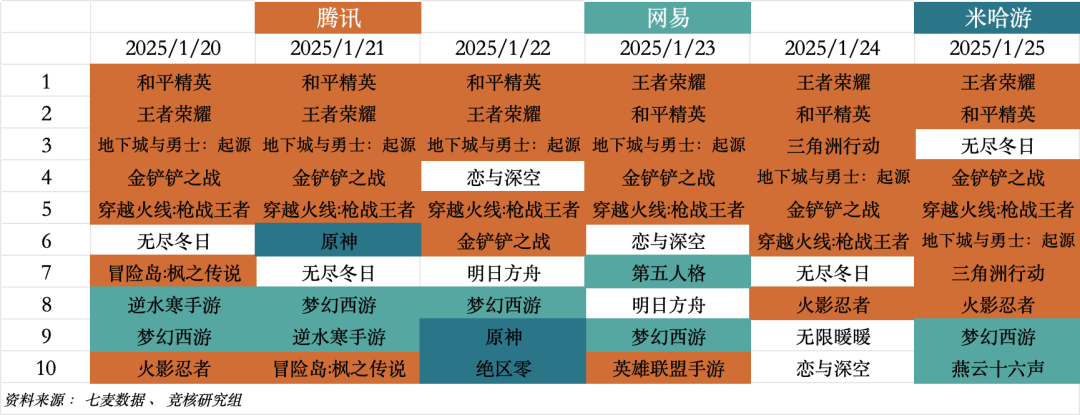 中国大陆市场2025年1月20日-2025年1月25日iOS游戏类畅销榜中,《和平精英》《王者荣耀》榜首接力。