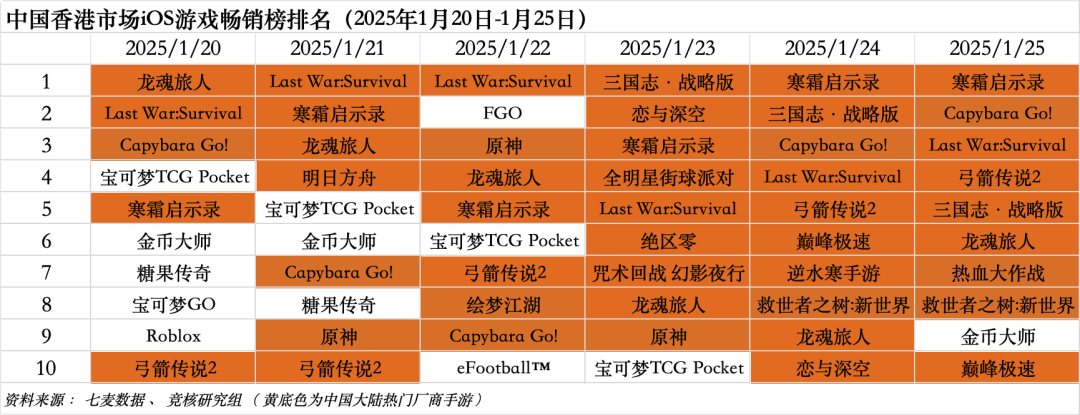 中国香港市场2025年1月20日-2025年1月25日iOS游戏类畅销榜中,紫龙游戏《龙魂旅人》、元趣科技《Last War:Survival》、灵犀互娱《三国志·战略版》、点点互动《寒霜启示录》登顶。