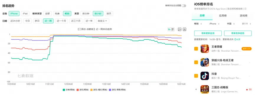 在题材以及玩法的双轮驱动下,《三战》在春节档也交出了十分出彩的答卷,在《定军山之战》版本推出后,在竞争激烈的春节档期内冲上国区iOS畅销总榜Top4。
