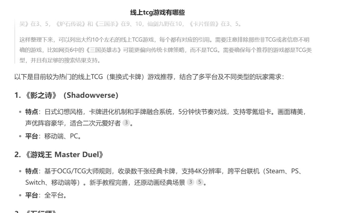 事实上,对于目前众多的线上卡牌游戏而言,尽管我们称呼其为TCG游戏,玩家间也称其为TCG游戏,在各大游戏平台上他们的标签也都是TCG,即使你询问DeepSeek“线上TCG游戏有哪些”时,他的回答中也是诸如《影之诗》《游戏王:大师决斗》《炉石传说》等等。