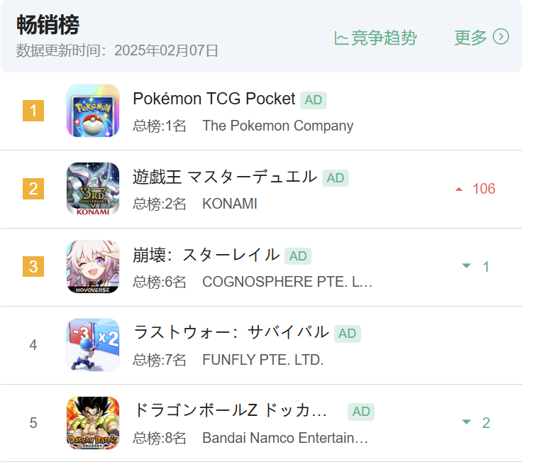 日前,随着《游戏王:大师决斗》三周年纪念活动的开启,在热门卡组“闪刀姬”的加持下,其移动端在日本的iOS畅销榜排名直升106名,来到第二名的位置。而第一名则是于过年期间开启新卡包和交换功能的《Pokémon TCG Pocket》。
