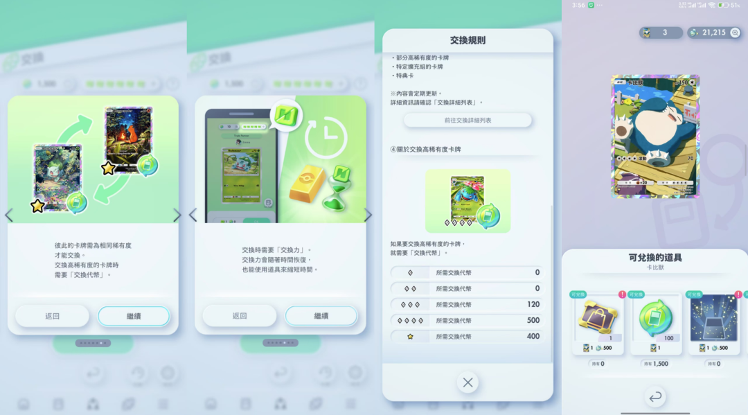 玩家在交换◇3,◇4以及☆1的高稀有度卡牌时,需要消耗“新代币”以及“交换力”。然而新代币只能通过分解2张以上的卡牌才能获得,而分解一张☆1的卡牌能获得100新代币,但交换一张☆1却需要400新代币,手续费是卡牌本身价值的四倍。此外每次交换还要消耗一个交换力,而这个交换力只能通过时间恢复或者花钱购买。