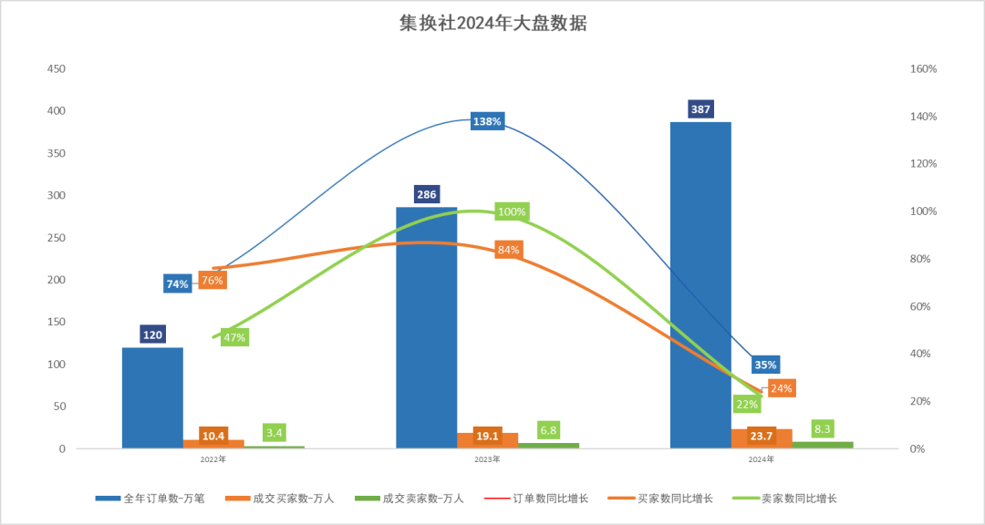 2024年,集换社全年成交订单数为387万笔,较2023年增长35%。年度成交买家23.7万人,较2023年增长24%。年度成交卖家8.3万人,较2023年增长22%。与23年全年成交订单数138%的增长相比,2024年中国线下TCG市场增长迎来了放缓,但成交的买家数量增长速度依旧超出卖家数量。
