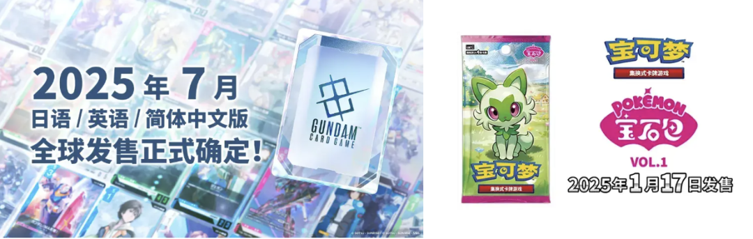 而除了上述两款产品以外,新产品方面还有《高达》的TCG同样将于25年推出中文版本,老产品《宝可梦》也是在1月推出了151卡包,以及简中独占的“宝石包 第一弹”,可谓是火力全力,试图延续23年的高增长率。