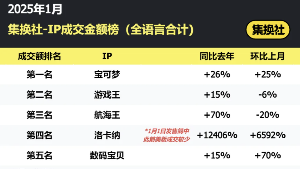 在2025年开年第一天,迪士尼就率领旗下TCG卡牌“洛卡纳”正式进军中国市场,首月便成功拿下了成交金额榜的第四名,将《数码宝贝》赶了下去。而如果只计算单语言产品,其更仅次于《宝可梦》和《游戏王》,可谓是来势汹汹。