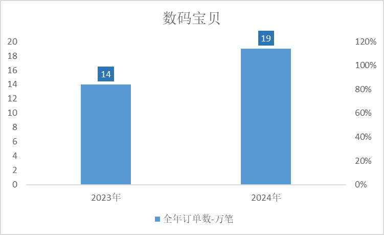 而后是国内TCG四大金刚的最后一名:《数码宝贝》“DTCG”,2024年,其成交订单为19万笔,较2023年提高36.8%。年度成交卖家0.69万人,较2023年增长23.31%。年度成交买家1.26万人,较2023年增长5.38%。
