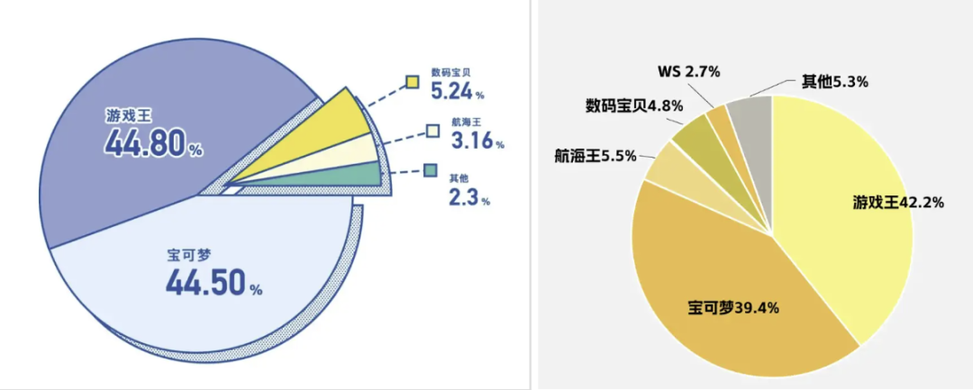 成交金额占比的格局与张数类似,但游戏王、宝可梦、数码宝贝、航海王四大品类以外的板块以外的品类占比为6.3%,较去年提升近5%。