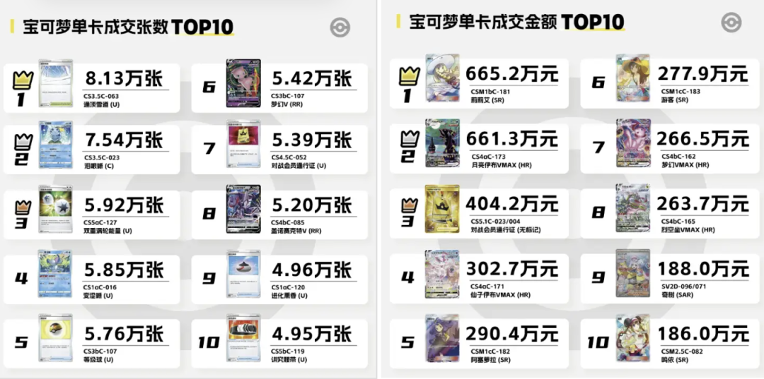 而在单卡成交量方面,通顶雪道以8万张的惊人数字登顶,同时前十也多是以强力单卡,或强力卡组组件为主。但在单卡成交额方面,与游戏王小叶,刻魔等强力卡片不同,宝可梦则多以妹卡,收藏卡为主。“莉莉艾”“阿塞萝拉”“奇树”“伊布”等人气角色或宝可梦进入前十。