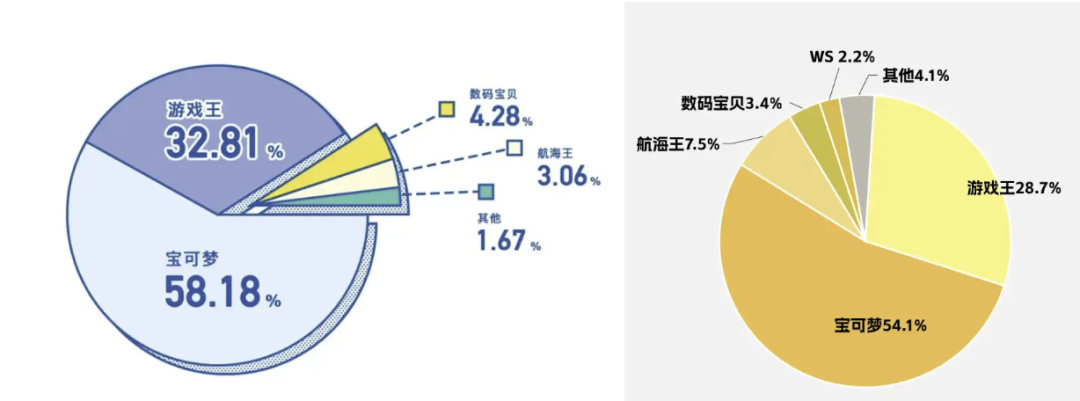 尽管相比日本这样成熟的市场数量依旧较少,但如今的中国TCG市场已经存在包括《宝可梦》《游戏王》《碧蓝航线》《UA》《七圣召唤》《WS》《影之诗》《海贼王》在内的十几款TCG产品。中国TCG市场结构正变得更健康,品类逐渐丰富并且权重越来越分散。