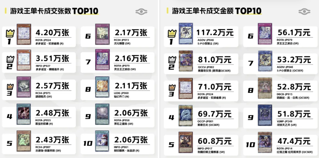 在以强竞技为核心的游戏王中,强力的卡牌一直都是卡牌买卖的核心。无论是单卡成交张数,还是单卡成交金额的前十名中,“鸟G”,“小叶”等强力单卡都是榜上有名。因此在强度,情怀以及较低的入坑成本三重加持下,游戏王在去年迎来了大幅增长。