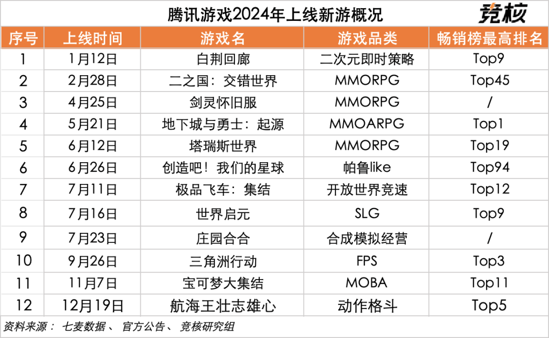 据竞核不完全统计,去年腾讯游戏大约上线了12款新游戏,包括《白荆回廊》、《地下城与勇士:起源》、《极品飞车:集结》、《世界启元》、《三角洲行动》、《宝可梦大集结》、《航海王壮志雄心》等。