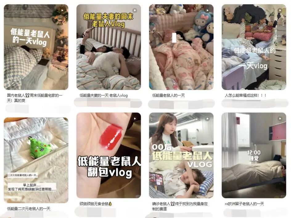 这种vlog一开始只在小圈层流行,但很快引起了更多年轻人的共鸣,不少人躺在床上刷着视频就“确诊为低能量老鼠人”,也乐于称呼自己是“老鼠人”。