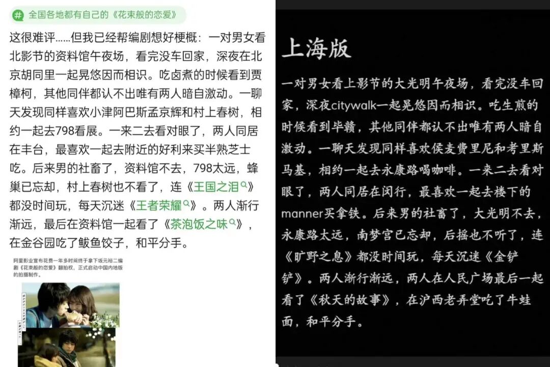 一时之间,全国各地版《花束的恋爱》剧本梗概被创作出来,彼时作为对比项的游戏还是《王者荣耀》和《金铲铲之战》,如果今年再有人仿写这样的剧本,被当成典型例子的可能是更休闲、更轻松、更加不需要花费文化体力的游戏了吧。