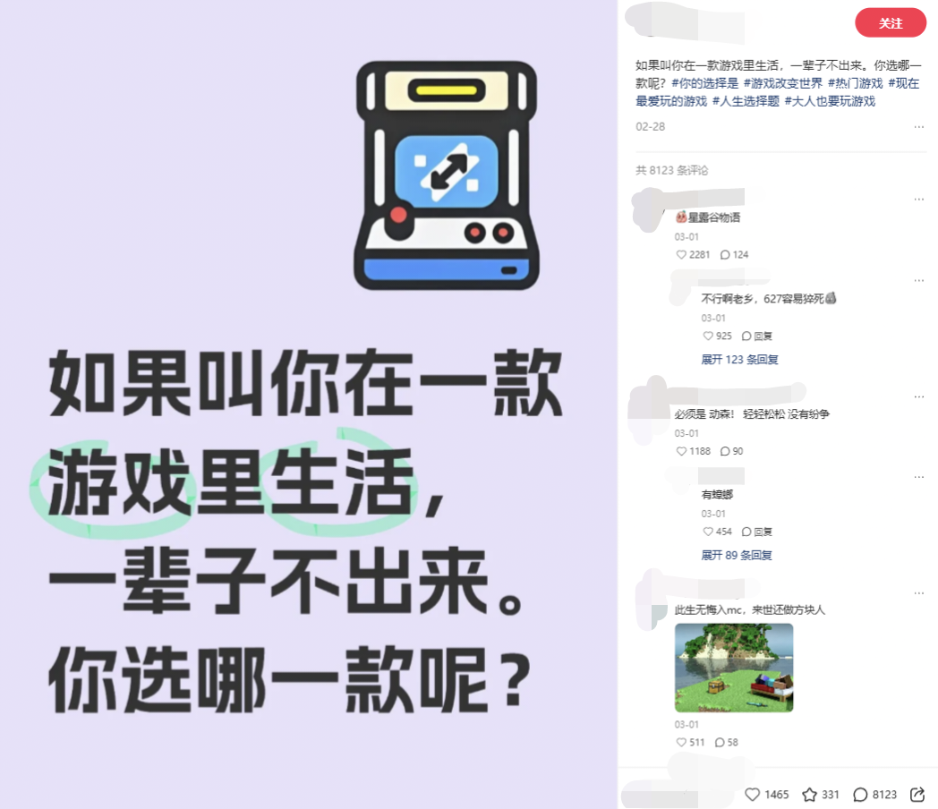 有人发起过“如果叫你在一款游戏里生活,选哪款”的讨论,评论区高赞当选的前三名游戏分别是《星露谷物语》《动物森友会》《我的世界》。