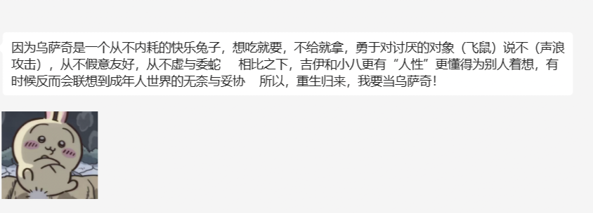 情绪也是流动的,同一种电子布洛芬带来的疗效因人而异。比如Chiikawa是众所周知的反乌托邦萌系IP,凭借可爱出圈,但是一位朋友表示,喜欢Chiikawa中角色的原因如下: