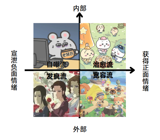 结合社区观察与身边玩家的意见,笔者将电子布洛芬的疗效大致分成了四类。尽管电子布洛芬的最终目标毫无疑问都是让自己感到心情舒畅,但是在达成方式上,可以分为内部与外部两类对象,以及宣泄负面情绪和获得正面情绪两种形式。