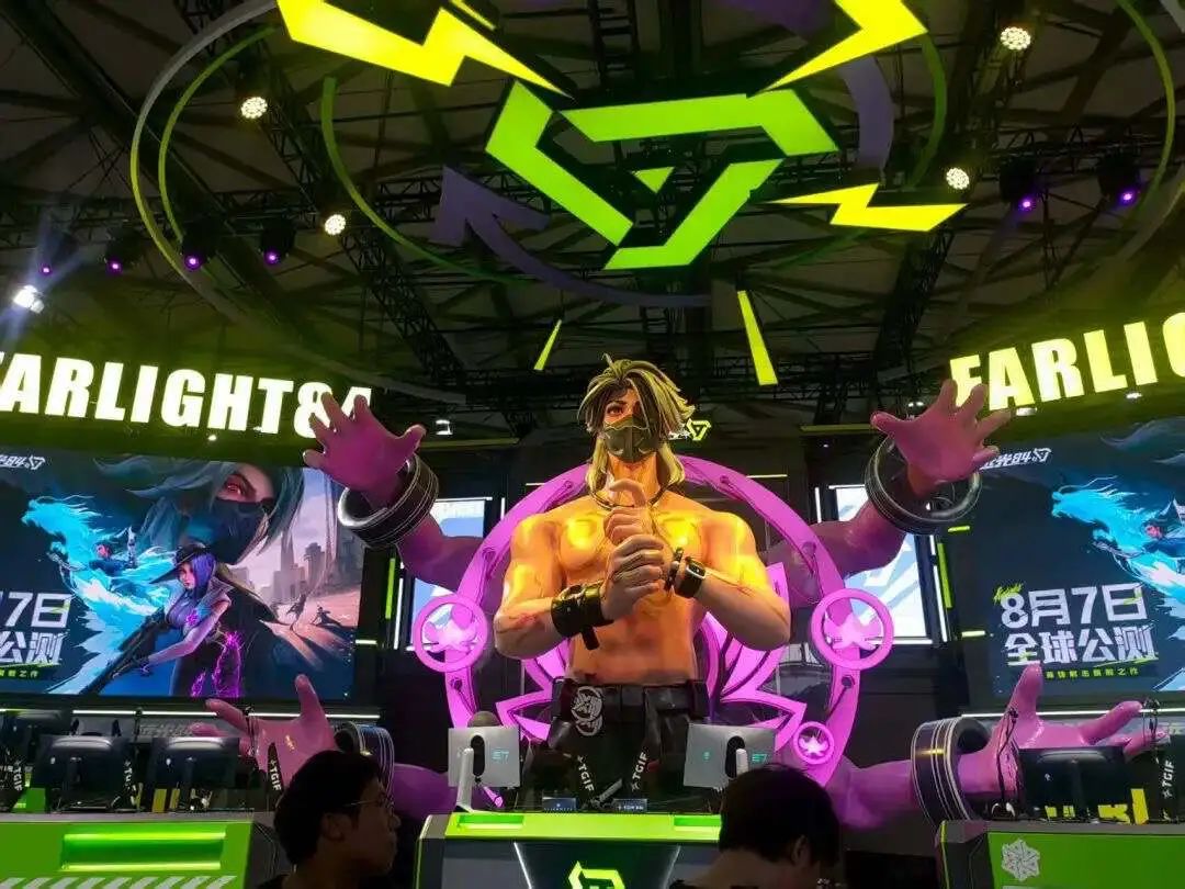 Walking further out, the big stage set by Lilith's game falls into view. Sure enough, this year's Lilith stage was arranged according to the visual effects of "Farlight 84." The oversized character installation in the center was especially prominent, and the whole stage looked very cool with sleek purple and fluorescent green.