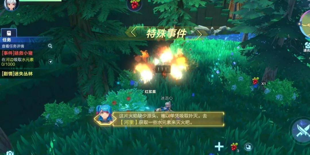 游戏中存在“冰”、“火”、“雷”、“毒”四大元素,元素之间相互作用,不仅可以与环境交互,还可以应用到战斗当中。