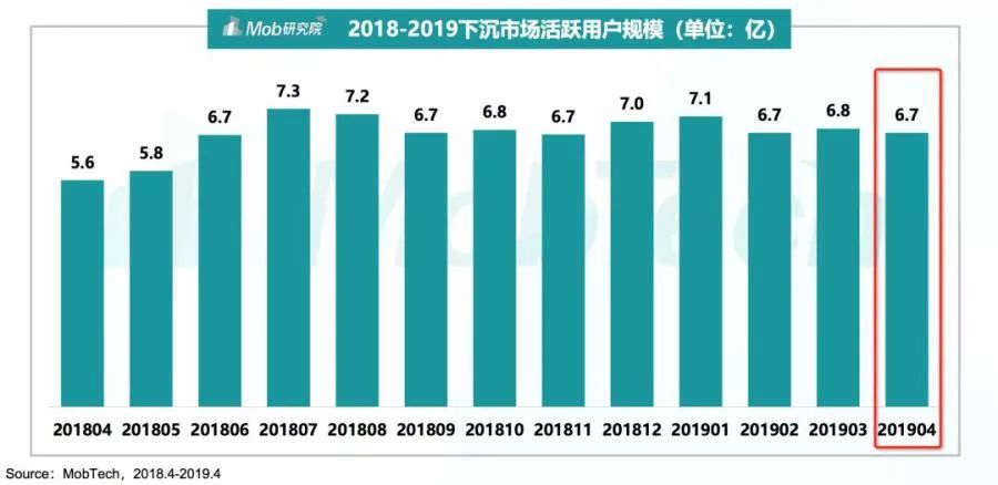 根据Mob研究院发布的《2019“下沉市场”图鉴》数据显示,截止至2019年4月,中国移动互联网下沉市场月活跃用户规模达到了6.7亿,占据了整个移动互联网超过一半的用户份额。