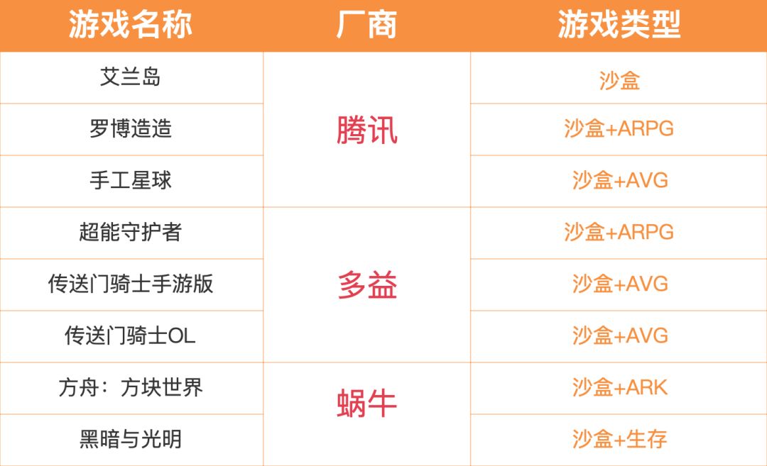 2018年,腾讯UP+大会发布的5款游戏中3款为沙盒类,同年多益发布3款、蜗牛发布2款沙盒演化游戏。