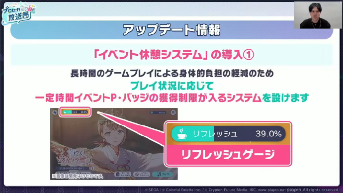 据介绍,这套系统将有一套游玩时长计量槽,当玩家进行单人 / 多人 LIVE、游玩我的「 世界」以及游玩排名赛都会让时长计量槽上涨,连续游玩约 18 小时就会让计量槽达到 100.0%,当计量槽满时,玩家将无法在游戏中继续获得活动积分以及活动徽章。如果 30 分钟内没有继续游玩的话,计量槽进度就会减少,玩家大约需要休息 6 小时才能将进度减至 0%,该套系统将在二月底更新至游戏。