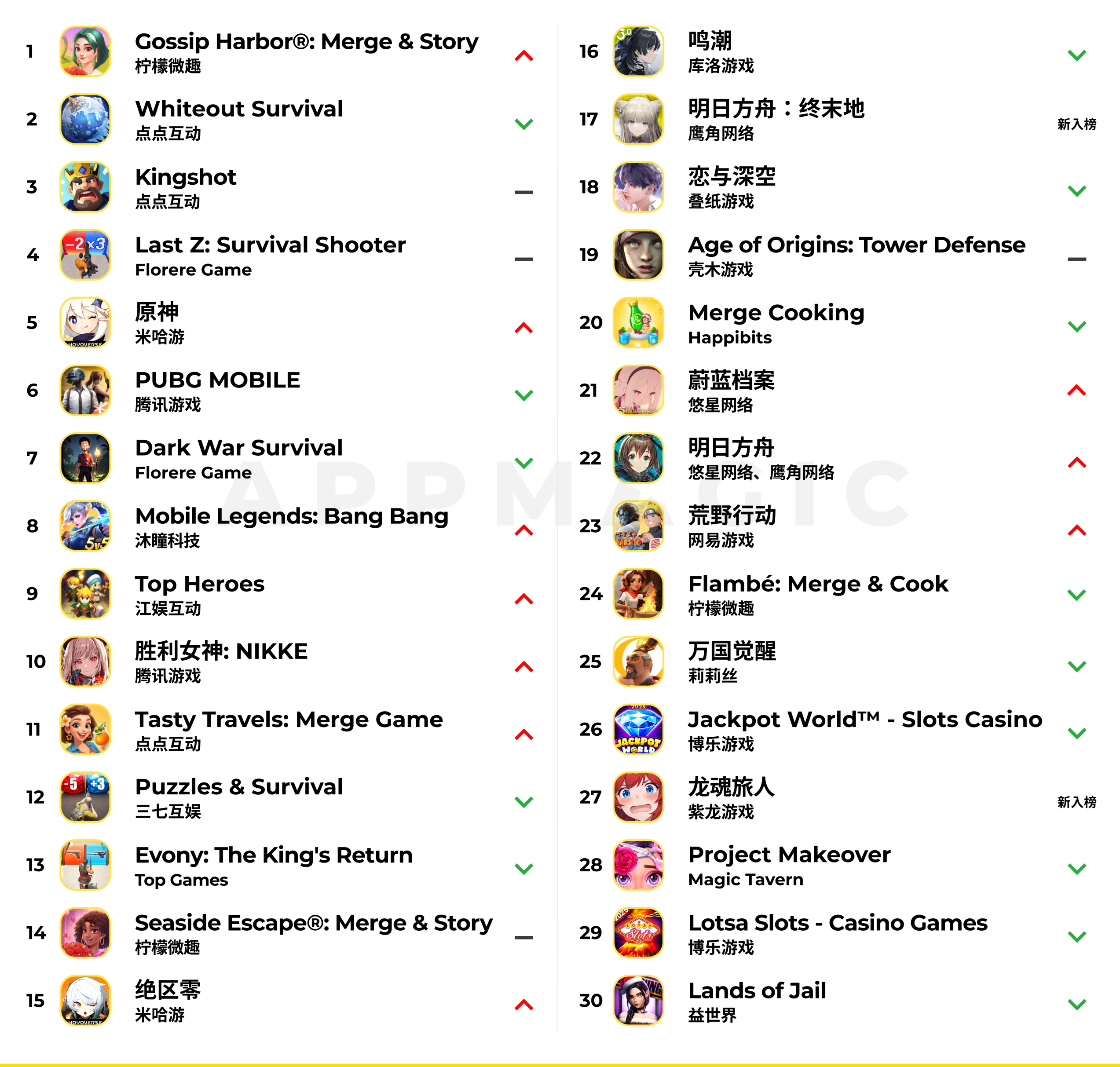 竞核2月5日消息,柠檬微趣二合手游夺得1月出海榜冠军:今日,AppMagic发布了2026年1月中国出海手游排行与增长榜。柠檬微趣旗下二合手游《Gossip Harbor®: Merge & Story》首次夺得出海收入月度冠军,超越了2025年整年位居月度榜单榜首的点点互动《Whiteout Survival》。