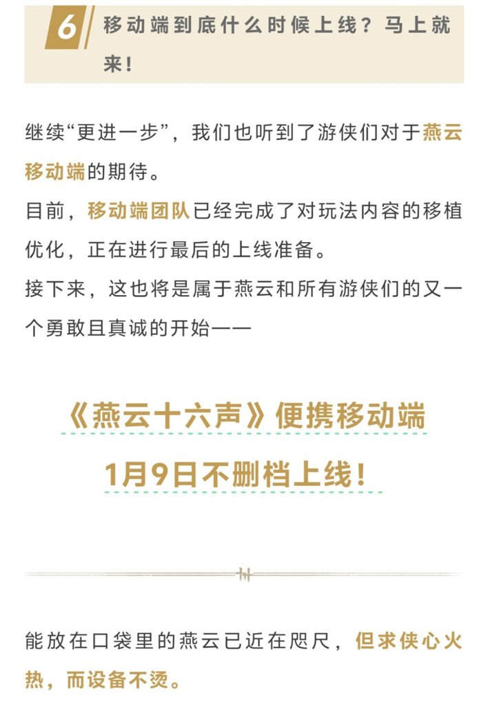 竞核12月30日消息,燕云十六声移动端1月9日上线:网易开放世界武侠动作游戏《燕云十六声》今日正式宣布,移动端将于1月9日正式上线。针对此前多端适配的争论,项目组表示会始终秉持初心,在PC端,带来极致沉浸、不打折扣的武侠代入体验;在移动端,提供便携轻松流畅好玩的趣味娱乐内容,玩家可以自由选择。