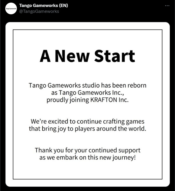 竞核1月2日消息,tango工作室重生:日前,Tango Gameworks工作室官方X发文宣布工作室更名为变更为“Tango Gameworks株式会社”,正式成为KRAFTON一员。Tango Gameworks是一家位于日本东京的游戏开发工作室,由著名游戏设计师三上真司于2010年创立。