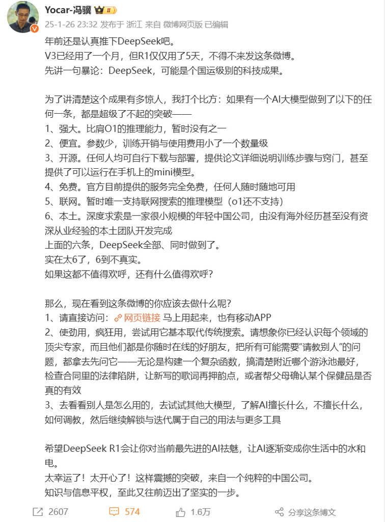 他说:“V3已经用了一个月,但R1仅仅用了5天,不得不来发这条微博。先讲一句暴论:DeepSeek,可能是个国运级别的科技成果!”
