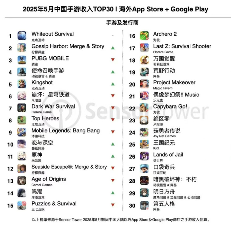 竞核6月16日消息,恋与深空海外收入超过国内:Sensor Tower发布了2025年5月中国手游产品在海外市场收入及下载量排行榜。柠檬微趣旗下以剧情为驱动的女性向合成手游《Gossip Harbor》游戏海外收入环比增长8%,同比大涨254%,首次攀升至出海手游收入榜第2名。