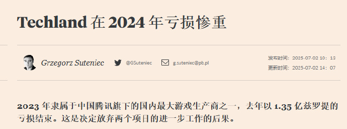 竞核7月4日消息,腾讯一海外工作室认亏2.68亿元:据波兰商业媒体报道,消逝的光芒开发商Techland此前中止了两个处于开发阶段的项目,导致腾讯在上一财年为此承担了约3700万美元的资产减记。2023年7月,腾讯以16亿美元的价格收购了Techland 67%的股份,成为这家波兰开发商的控股股东。