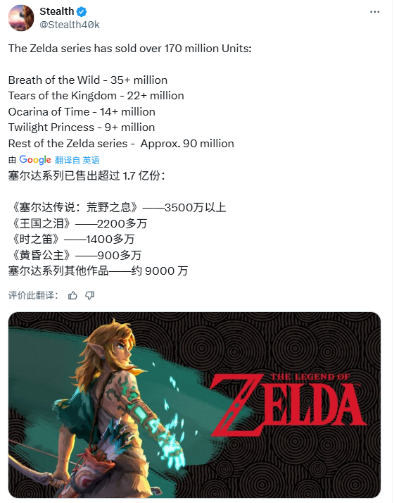 竞核8月15日消息,塞尔达系列全球销量超1.7亿份:游戏行业人员Stealth近期在社交媒体上透露,塞尔达系列游戏的全球总销量已突破1.7亿份。其中,《旷野之息》达到3500万份,《王国之泪》达到2200万份,《时之笛》达到1400万份,《暮光公主》达到900万份,塞尔达系列的其余作品总共约达到9000万份。