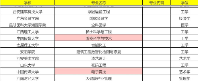 资料显示,中国传媒大学申报了“游戏科学与技术”与“电子竞技”两个新专业。包括南京传媒学院、长沙师范学院、南京艺术学院、中国美术学院、山西传媒学院、海口经济学院、北京城市学院、浙江传媒学院在内的13所高校,申报了“游戏艺术设计”专业。此外,长沙师范学院、河南体育学院、广西民族大学相思湖学院申报了“电子竞技运动与管理(教育学)”专业。
