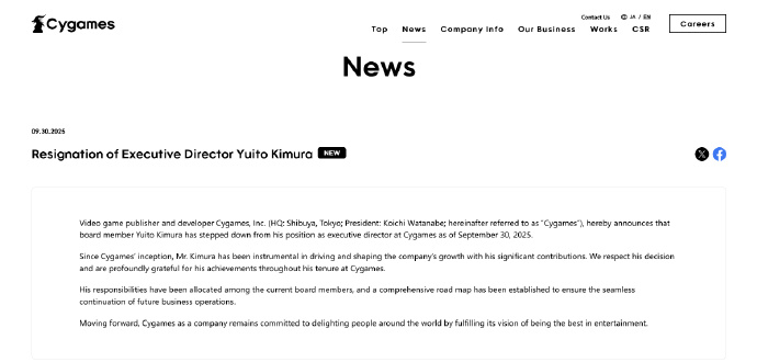 竞核9月30日消息,木村唯人退任Cygames执行董事:今日,Cygames发布公告称,曾担任过碧蓝幻想、碧蓝幻想Versus、碧蓝幻想Relink、影之诗、公主连结的Cygames制作人,董事会成员木村唯人已于2025年9月30日辞去Cygames执行董事一职。