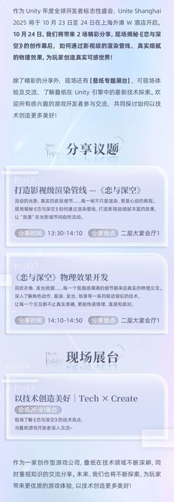 竞核10月15日消息,叠纸游戏将携《恋与深空》登台Unite Shanghai 2025,并于10月24日带来两场分享,揭秘《恋与深空》的创作幕后。除了精彩的分享外,现场还有“叠纸专题展台”,可现场体验及交流、了解叠纸在Unity引擎中的最新技术探索。