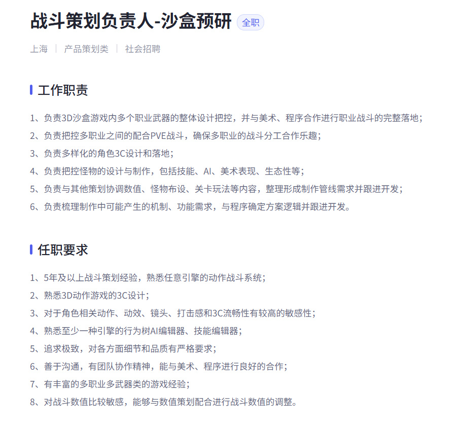 竞核10月27日消息,米哈游又曝光一款预研项目:近日,米哈游招聘官网上又放出一款预研项目的招聘信息,为“沙盒预研”游戏。根据招聘岗位的具体需求来看,沙盒预研项目应该是一款支持多人联网的动作游戏,并使用虚幻引擎制作,核心玩法上似乎还是以PVE玩法为主。