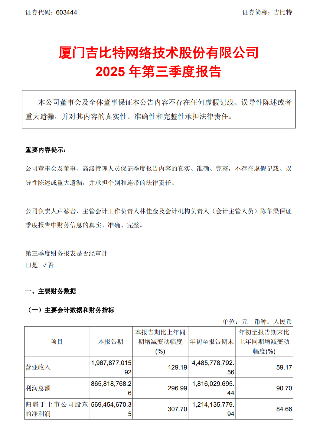 竞核10月28日消息,吉比特Q3净利润增长307%:吉比特今日发布了2025年Q3财报,2025年第三季度实现营业收入19.68亿元,同比增长129.19%;归属于上市公司股东的净利润5.69亿元,同比增长307.70%。
