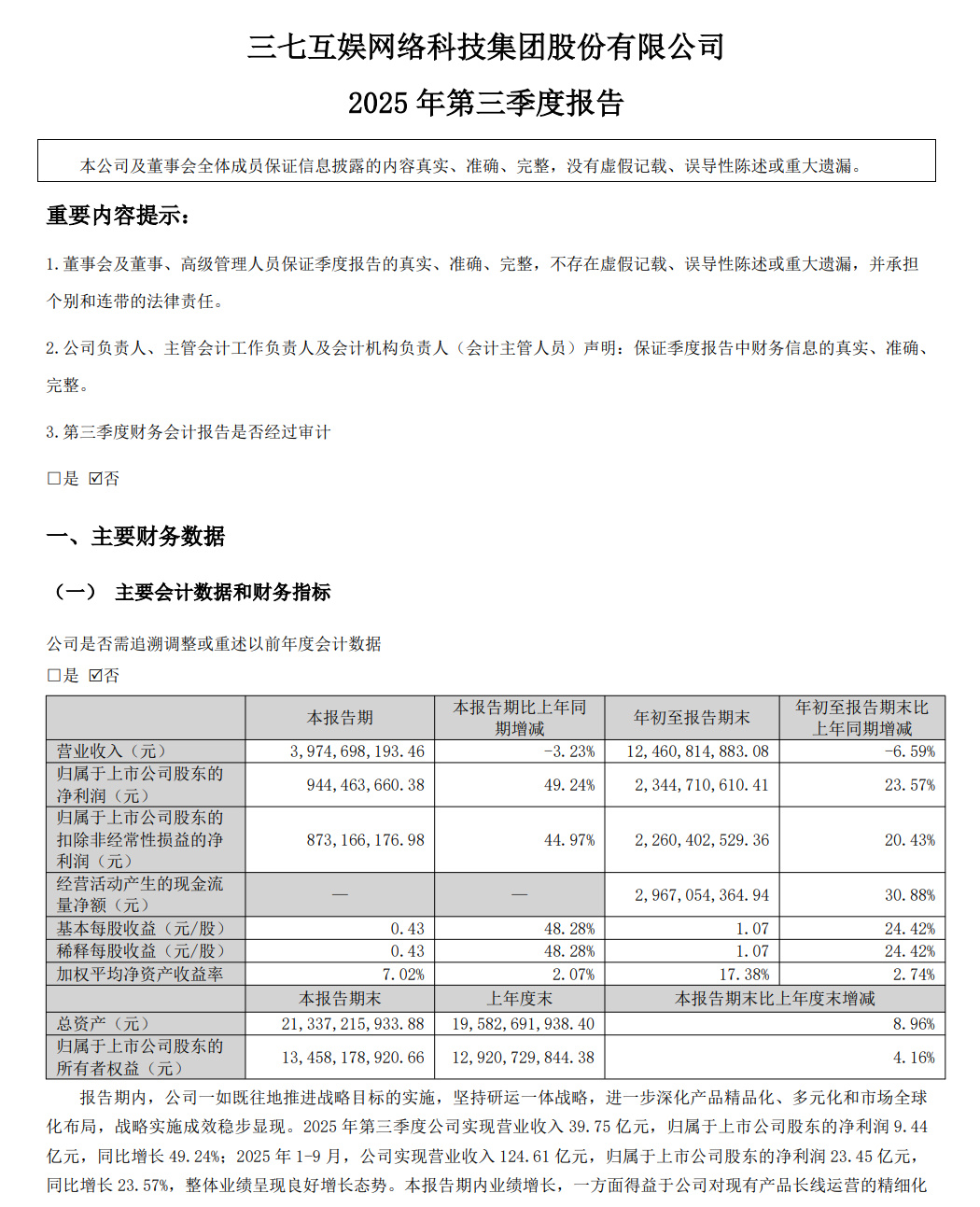 竞核10月28日消息,三七互娱Q3净利润超9亿:三七互娱(002555)今日发布2025年三季报,公司第三季度营业收入39.75亿元,同比下降3.23%;净利润9.44亿元,同比增长49.24%。2025年前三季度营业收入124.61亿元,同比下降6.59%;净利润23.45亿元,同比增长23.57%。