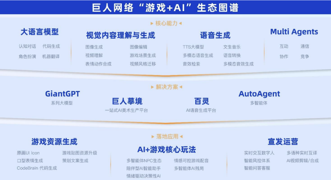 与此同时,在前沿科技领域,巨人网络持续布局AI等技术。自2023年起,公司陆续构建内部AI工具平台,应用于研发管线,以提升效能、降低成本。目前已形成包括GiantGPT对话模型、巨人摹境AI绘画、BaiLing-TTS多方言语音模型、CodeBrain代码生成模型、千影有声游戏生成模型在内的“游戏+AI”生态图谱。