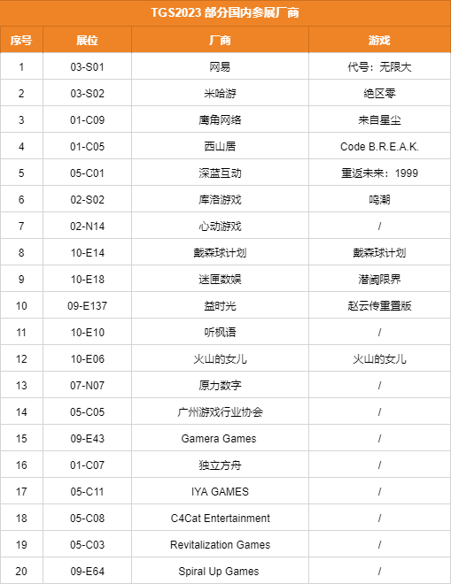 正如上图所示,我们看到了很多熟悉的面孔,比如网易(展台编号:03-S01)、米哈游(展台编号:03-S02)、鹰角网络(展台编号:01-C09)等一众国产厂商。我们不禁好奇,它们将为我们带来哪些新游戏呢?